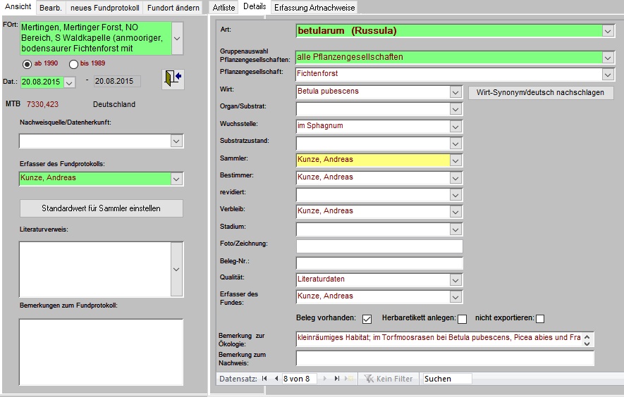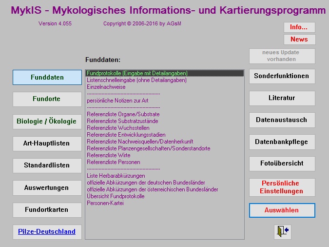Als Kartierungswerkzeug für unsere Datenbanken und Offline-Erfassung wird aktuell das Programm „MykIS“ verwendet, das auf dem Datenbankmanagementsystem „Microsoft Access“ basiert. Die Anwendung funktioniert auch mit der kostenlosen Laufzeitumgebung (Runtime), sodass kein Kauf von Microsoft Access oder gar Microsoft Office erforderlich ist. Bitte beachten Sie, dass MykIS ausschließlich mit der 32-Bit-Version läuft. Den Funktionsumfang können Sie dem beigefügten „MykIS Anwenderhandbuch“ (siehe Kasten „Dokumente“) entnehmen.