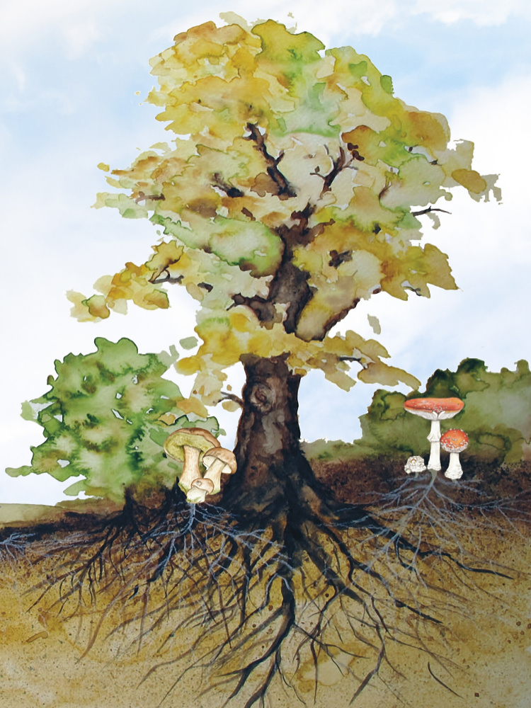 Über das unterirdische Pilzgeflecht stehen sie mit ihren Artgenossen in Kontakt und tauschen Nährstoffe aus. Je mehr Pilzpartner die Wurzeln einer Douglasie ummanteln beziehungsweise je größer dieses Pilznetzwerk ist, über das ein Baum mit seinen Artgenossen verbunden ist, desto breiter fallen die jährlichen Wachstumsringe aus.