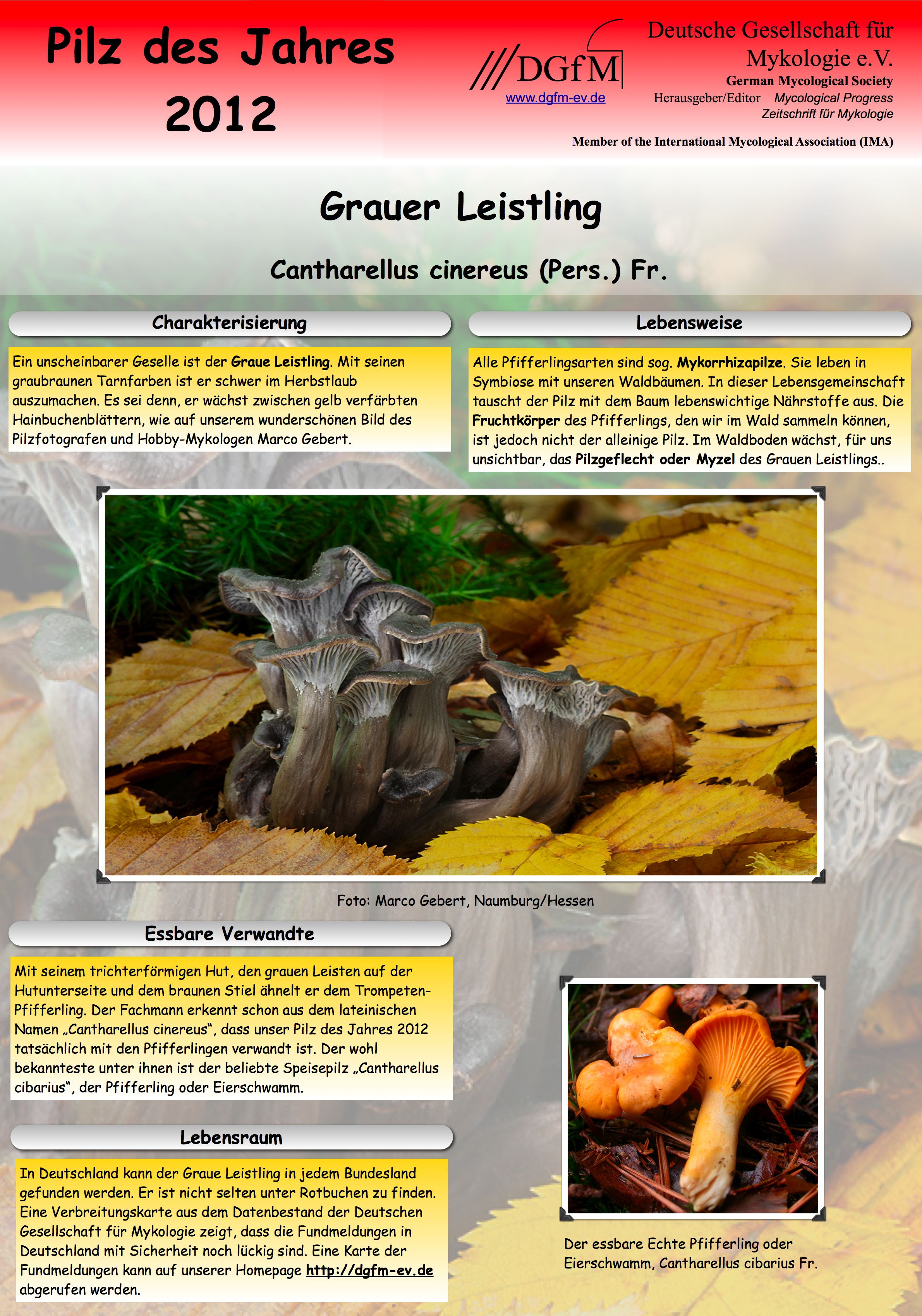 Ein unscheinbarer Geselle ist der Graue Leistling. Mit seinen graubraunen Tarnfarben ist er schwer im Herbstlaub auszumachen. Es sei denn, er wächst zwischen gelb verfärbten Hainbuchenblättern, wie auf unserem wunderschönen Bild des Pilzfotografen und Hobby-Mykologen Marco Gebert. Mit seinem trichterförmigen Hut, den grauen Leisten auf der Hutunterseite und dem braunen Stiel ähnelt er dem Trompeten-Pfifferling. Der Fachmann erkennt schon anhand des lateinischen Namens „Cantharellus cinereus“, dass der Graue Leistling tatsächlich mit dem Pfifferling verwandt ist.