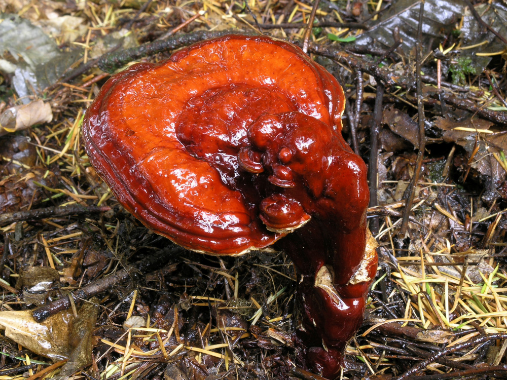 Glänzender Lackporling (Ganoderma lucidum) an Wurzelresten im Boden (Foto: Dr. Matthias Theiß / DGfM)