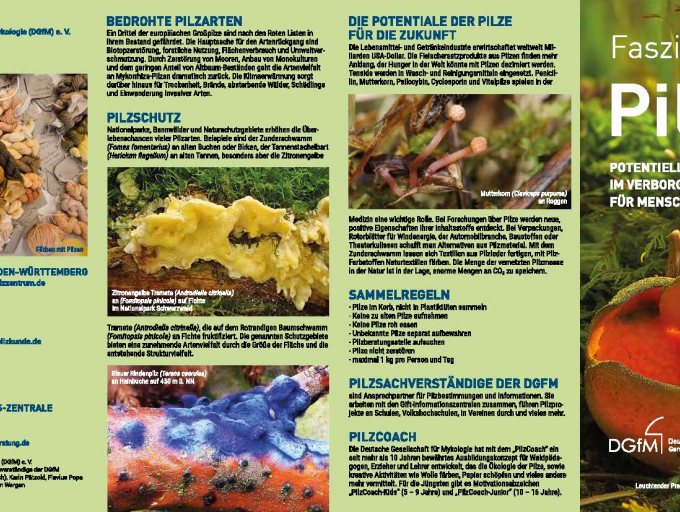 Gemeinsam mit dem Naturpark Schwarzwald gibt die DGfM diesen allgemeinen Flyer über Pilze in einer überarbeiteten Neugestaltung heraus. Der Inhalt umfasst Lebensweisen, Fruchtkörperformen, Ökologie, Naturschutz, sowie einige Informationen über die DGfM.