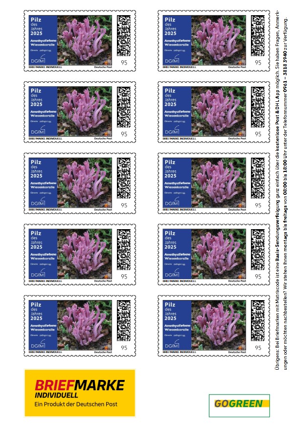Seit 2014 lässt die DGfM von der Deutschen Post Briefmarken mit dem „Pilz des Jahres“ als Motiv in limitierter Auflage herstellen. Die aktuellen Marken der Amethystfarbenen Wiesenkoralle - unser Pilz des Jahres 2025 - und auch noch einige ältere Motive wie dem Sumpfhaubenpilz oder dem Schopftintling sind ab sofort erhältlich. Danke an Dr. Rita Lüder für die ansprechende Gestaltung der Marken!