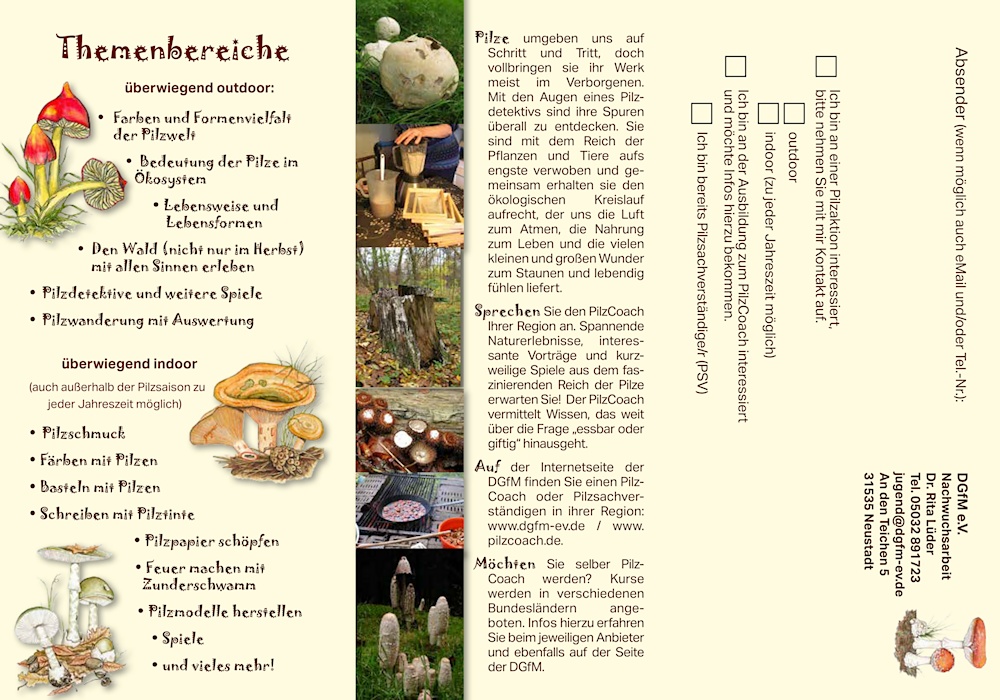 Der Bereich Nachwuchs freut sich über Multiplikatoren, die über diesen kreativen, ökologischen und spielerischen Zugang zum Thema Pilze informiert. Der Flyer eignet sich für Pilzausstellungen und andere Veranstaltungen.