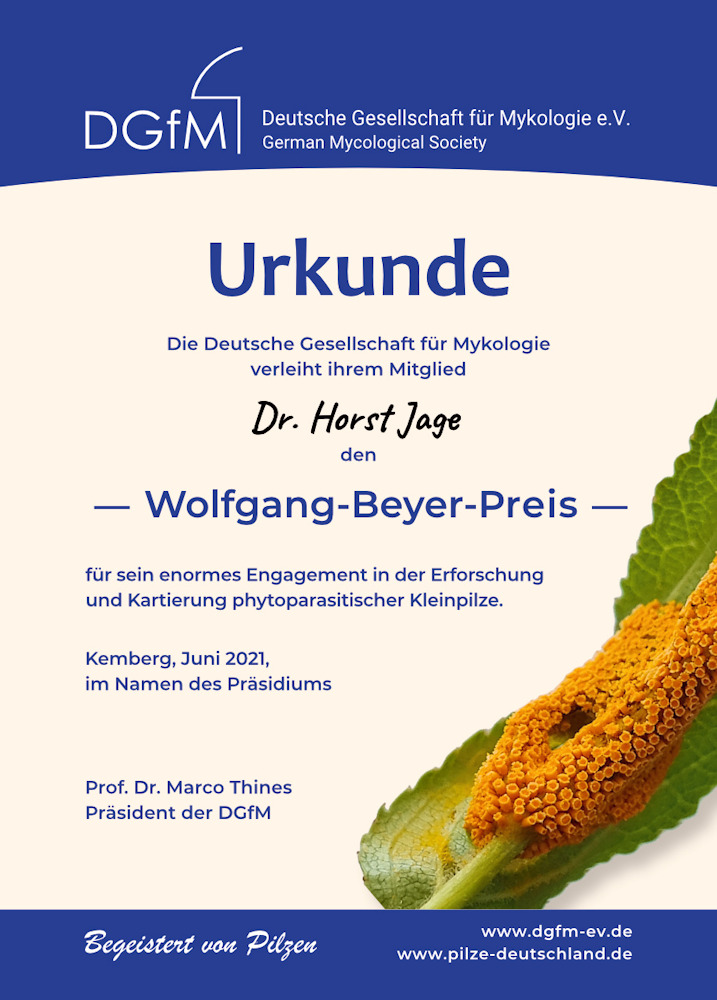 Der Wolfgang-Beyer-Preis ging 2021 an Dr. Horst Jage für für sein enormes Engagement in der Erforschung und Kartierung phytoparasitischer Kleinpilze. Die Verleihung erfolgte am 2. Juli in Kemberg durch Prof. Dr. Marco Thines, den Präsidenten der DGfM.